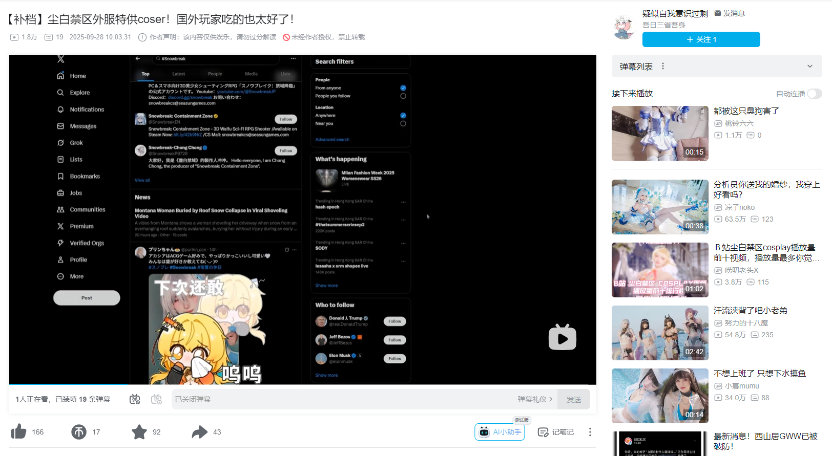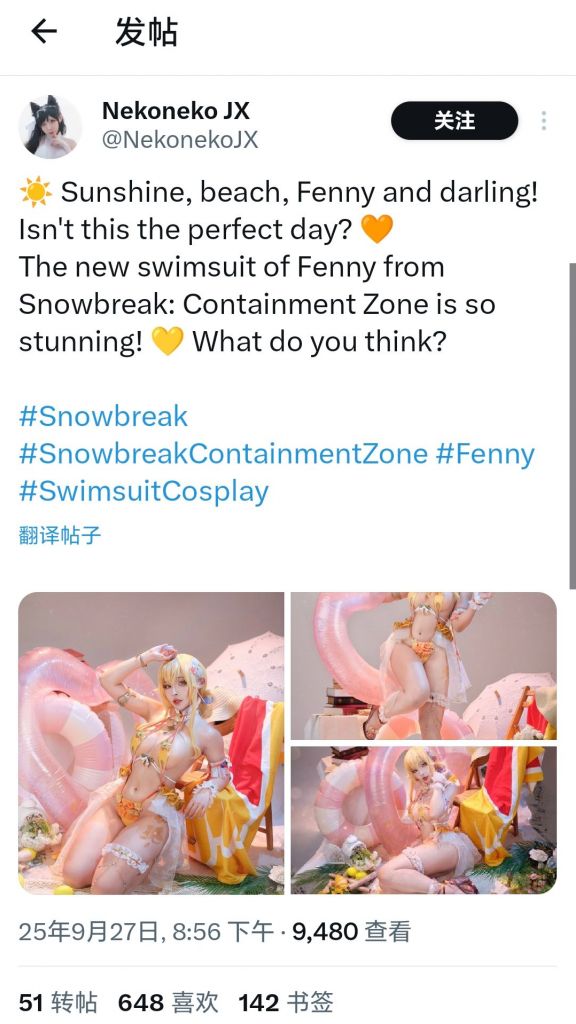 2025-09-27 【事件】【0927背誓】在推特(X)的尘白禁区(国际服)话题上,突然出现大量的职业COSER发布尘白新版本新角色/新时装的COS套图