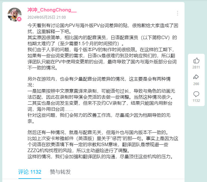 2024-05-25 【官方承诺】冲冲_ChongChong__(尘白禁区制作人),关于对海外翻译管控承诺