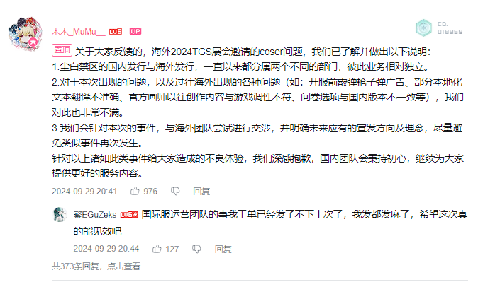 2024-09-29 【官方承诺】木木_MuMu__(尘白禁区制作人),关于对海外Coser管控承诺